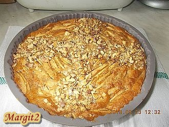 Egy 24 cm-es átmérőjű szilikonformát vajjal kikenünk, liszttel megszórunk, majd beleöntjük a masszát, és elsimítjuk a tetejét. Majd a másik 2 almát is meghámozzuk, a magházát kidobjuk, és vékony szeletekre vágjuk, majd a tésztába nyomkodjuk elosztva, a maradék vágott diót is rászórjuk. Utána a tetejét megszórjuk a 3 evőkanál barna cukorral.