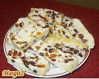 Egy 35x 27 cm-es sütőpapírral bélelt tepsibe beleöntjük a massza felét. Arra mazsolát, és aszalt gyümölcsöt szórunk. Végül ráöntjük a massza másik felét.
