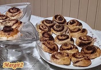 Elkészítése: A túrót elkeverjük a porcukorral. Hozzáadjuk az olajat, tejet majd a lisztet, sót, sütőport és a szódabikarbónát is. Jól eldolgozzuk. Lisztezett deszkán kinyújtjuk, kb. 3 mm-esre. A tészta tetejét megkenjük az olvasztott vajjal. Arra rákenjük a kakaós tojásfehérjés keveréket, majd feltekerjük. Éles késsel 2 cm vastag szeletekre vágjuk.