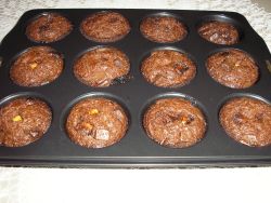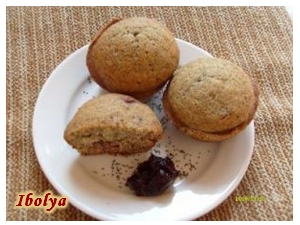 Ha megsült , tálra rakjuk. Fél tábla csokoládét és 2 evőkanál sárgabaracklekvárt összemelegítünk, és a muffinokra kenjük.