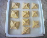 nyújtjuk, négyzetekre daraboljuk. Mindegyik közepébe kicsi
