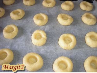 A hozzávalókat összegyúrjuk, és 1 órára a hűtőbe tesszük. Majd körülbelül dió nagyságú golyókat formálunk belőle. A tészta közepébe egy mélyedést nyomunk vagy nagyobb fakanállal, vagy én például egy kemény parafa dugóval csináltam. (A sülés közben feljön, ezért kell nagy mélyedés!)