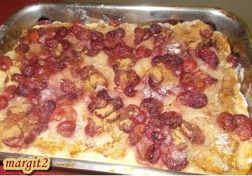 A másik tésztát is kinyújtjuk, és a meggy tetejére tesszük. Villával kiszúrkáljuk a tésztát. Végül a tetejét megkenjük felvert tojással. Előmelegített sütőben 200 fokon kb. 22 perc alatt készre sütjük. (Tűpróba!) Hagyjuk kihűlni a tespsiben, és hidegen szeletelhető!