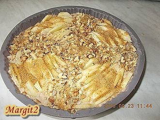 Egy 24 cm-es átmérőjű szilikonformát vajjal kikenünk, liszttel megszórunk, majd beleöntjük a masszát, és elsimítjuk a tetejét. Majd a másik 2 almát is meghámozzuk, a magházát kidobjuk, és vékony szeletekre vágjuk, majd a tésztába nyomkodjuk elosztva, a maradék vágott diót is rászórjuk. Utána a tetejét megszórjuk a 3 evőkanál barna cukorral.