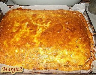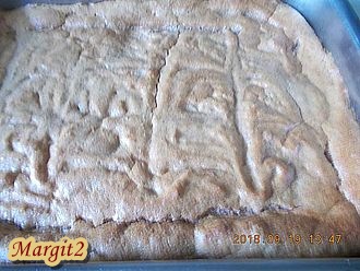 Egy 18x25 cm-es kikent és kilisztezett tepsiben egyenletesen eloszlatjuk a tésztát és előmelegített 170 fokos sütőben 30 perc alatt megsütjük. (Tűpróba!)