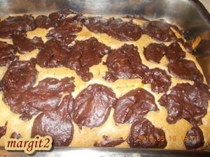 Csokimáz: 10 dkg vajat egy kis edényben gőz felett felolvasztunk, majd hozzáadunk 5 dkg kristálycukrot, és 3 evőkanál kakaóport. Csomómentesre elkeverjük, és hozzáadunk körülbelül 0,5 dl dl tejszínt, vagy tejet. Még azzal is keverjük egy kicsit. Tűzről levéve azonnal ráöntjük a tésztára, és gyors mozdulatokkal elsimítjuk rajta.