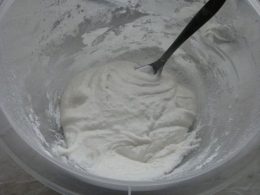 Ez a krém főleg szövegek minták írásához - rajzolásához, virágdíszekhez jó, és teljesen keményre meg tud száradni. Tehát előre is lehet virágokat csinálni és később felhasználni akár 1 év elteltével. Nagyon fontos hogy minden edény, kanál, keverő lapát stb. teljesen zsiradék mentes legyen, mert különben nem verődik fel a krém arra szilárdságra ,amivel dolgozni lehetne, és egy idő után összeesik a krém.)