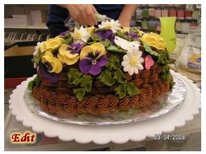 ... ez a torta pedig Noémi vajkrémből és fondantból készített virágkosara, aminek értékét növeli, hogy semmi profi segédeszköz nem áll rendelkezésére: