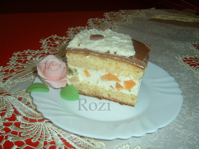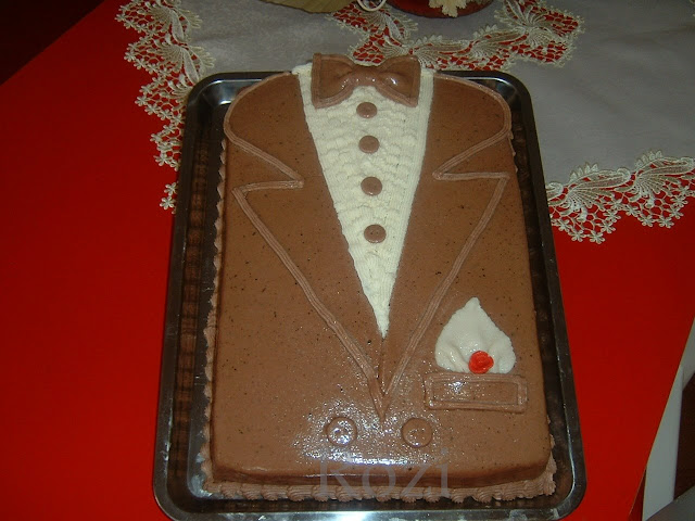 ÖLTÖNY TORTA Hozzávalók : 8 tojásból készült piskóta 8 tojás,8 kanál víz,16 evőkanál cukor,16 evőkanál liszt,1 cs sütőpor. A szokásos módon piskótát sütünk. Krém :fél liter tejszínt (hulala)felverünk kemény habnak,félretesszük. 2 csomag zselatint 1 dl kompót lébe beáztatjuk. 4 egész tojást 8 halmozott evőkanál cukorral gőz fölött addig kavarunk amíg jó tejföl sűrűségű lesz,ekkor hozzákeverjük a feloldott zselatint és hűlni tesszük,közbe közbe megkeverjük . Egy ananász és egy barack kompótot,3-4 kivit apró kockákra vágunk. A felvert tejszínhabot és tojásos krémet jól összeforgatjuk,félreteszünk belőle annyit hogy behúzzuk kívülről a tortát, a többibe beleforgatjuk a megvágott gyümölcsöket.(Lehet más gyümölccsel is készíteni) A piskótát ketté szeljük,meglocsoljuk a rummal ízesített kompótok levével,rárakjuk a krémet,szépen elsimítjuk,rátesszük az ugyancsak meglocsolt piskótát ,bevonjuk a félretett krémmel és hideg helyre tesszük. Mikor jól megdermedt bevonjuk fondanttal . A megmaradt fondantból öltönyre hasonló darabkákat vágunk és sziruppal ráragasztjuk. 10 dkg vajat, 20 dkg porcukorral egy evőkanál tejjel habosra kavarunk és tortadíszítővel ing formát nyomunk rá.Tovább ízlés szerint díszítjük. ![]() ![]() |