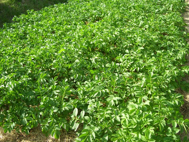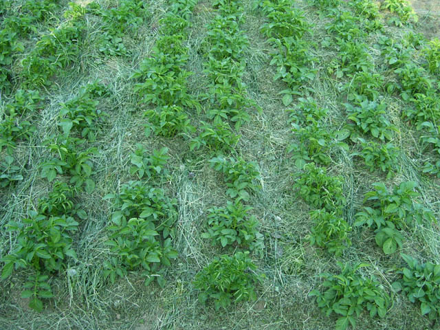 A krumpli ágyásom ma. A takarás segít megőrizni a nedvességet a talajban. Hogy a múlt heti jégeső csapadékmennyisége hatékonyabban hasznosuljon, bekapáltuk és letakartam. (Ezért nem látszik a barázda). 40cm-s sorközt használunk a talajfelület jobb kihasználása végett.Kisebb felület kevesebb földmunkával jár és a takarási igénye is kevesebb. A sűrű beültetés erősebb tápagyag ellátást igényel, amit a fészek komposzttal való megtöltésével érek el. A vastag takaróréteg elkorhadása is jelentős mennyiségű humusszal gazdagítja a talajt. Kapálógépet nem használok vegetációs időszakban, az egyszeri betöltést kézi kapával végezzük. Gyomtalanításra nincs szükség, mert a vastag takaráson a gyomok nem képesek áttörni. | |||