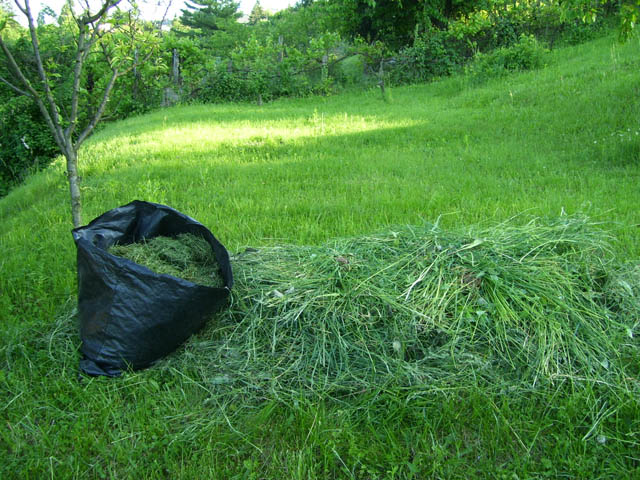 A takargatáshoz szükséges kellékek: kézikaszával és fűnyíróval vágott fű (zsákban). A kézikaszált fűvel vastagon a sorok között takarok.A finomra összeszecskázott gyepnyiradékkal közvetlenül a növények tövei körül vékony rétegben. Gyepnyíradékkal nem szeretek vastagon takarni mert az rosszul szellőzik. | |||